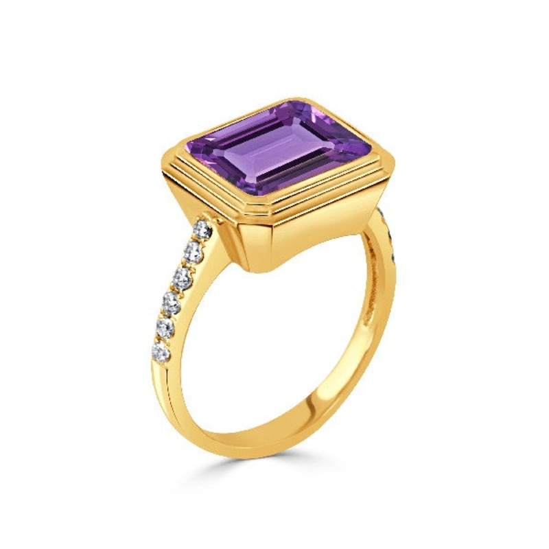 18K yellow gold ring with a 3.97ct emerald cut amethyst and a diamond accented band 0.22cttw