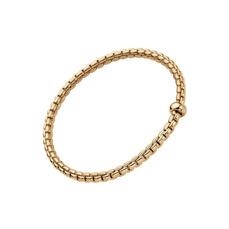 This 18 karat yellow gold FOPE Eka Flex'it bracelet features a single rondel set with a 0.01 carat round G color VS1 clarity diamond and the FOPE patented system Flexit. This system makes the jewelery stretch thanks to microscopic 18 karat gold springs ins