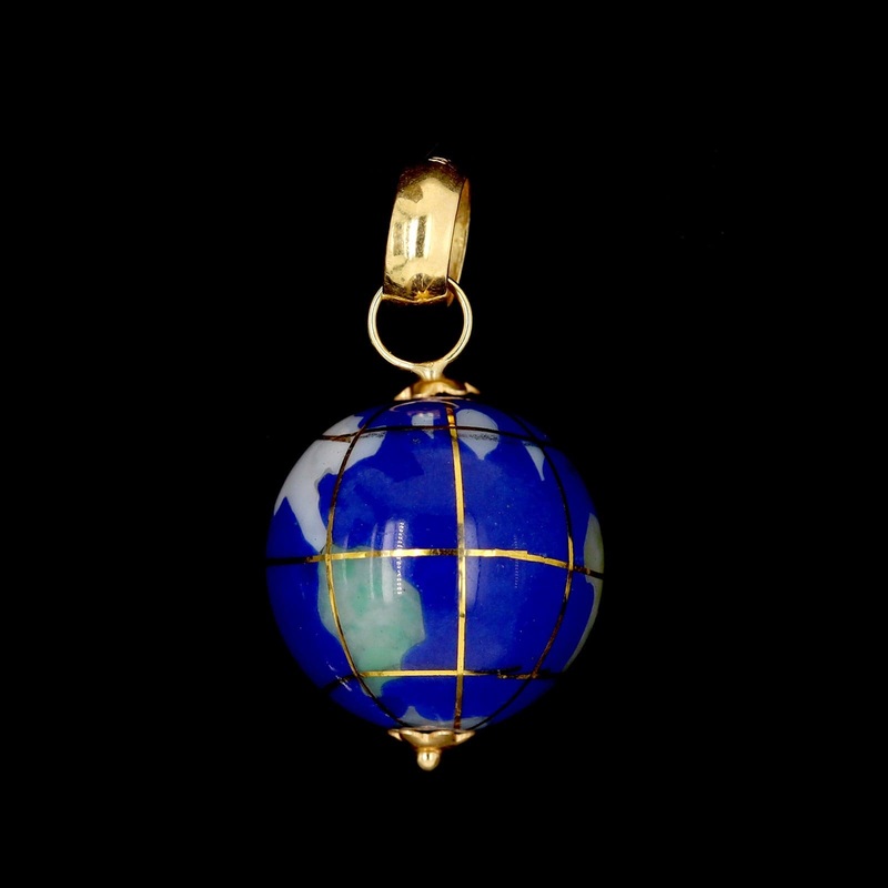 18K Yellow Gold Estate Enamel Globe CharmLength 1 1/8"