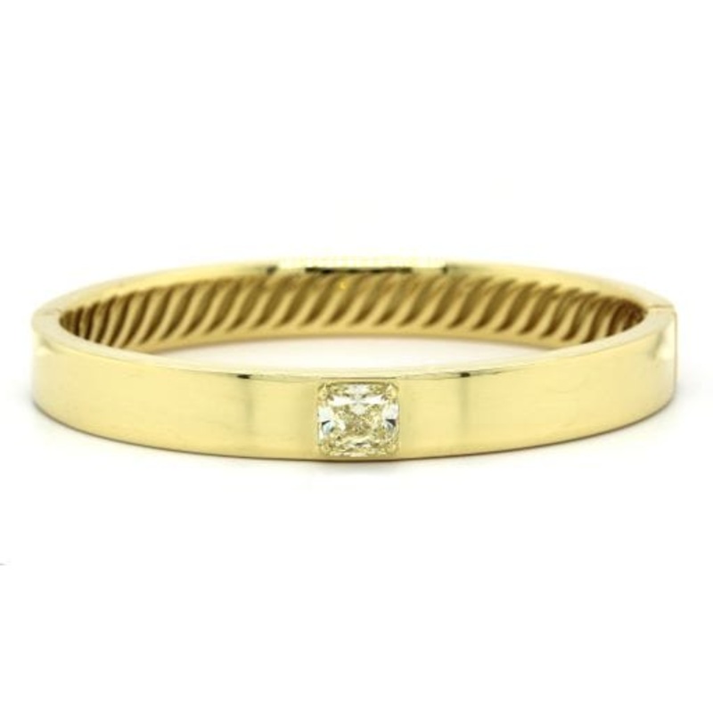 18k yellow gold fancy bangle featuring a cushion cut diamond.