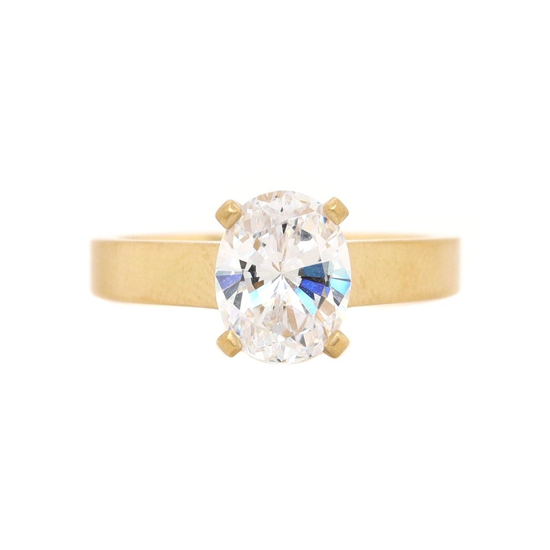 18k yellow gold flat shank cathedral mounting with a satin finish for a 2ctw. oval center stone.