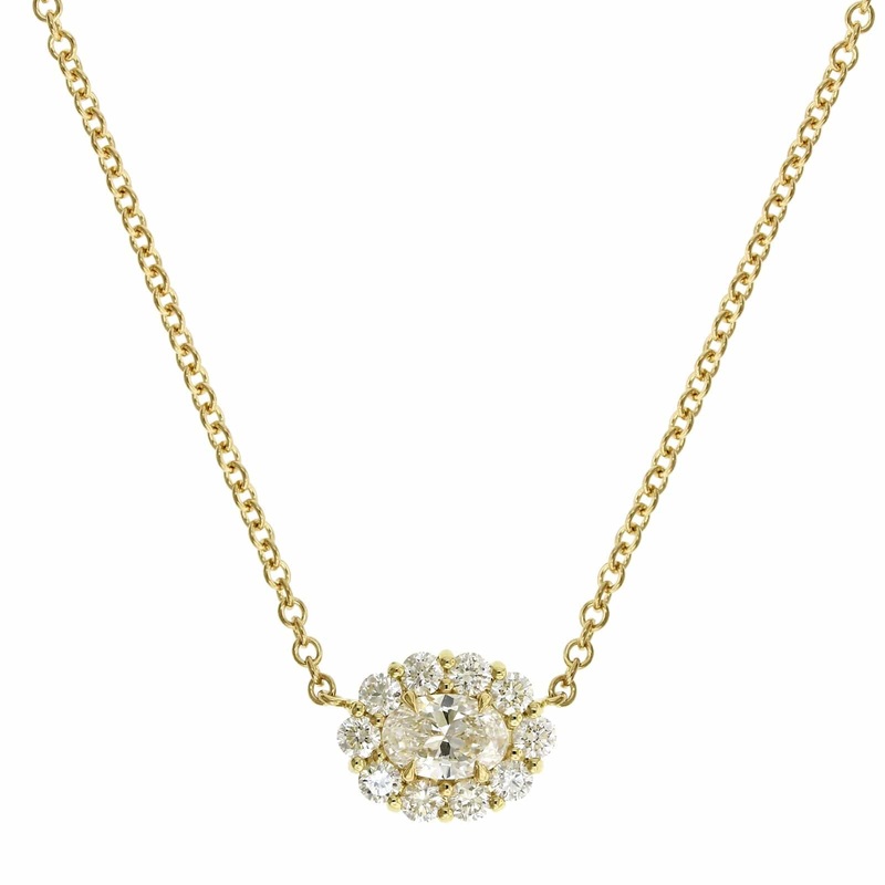 18k yellow gold necklace containing a certified oval diamond surrounded by diamond halo.