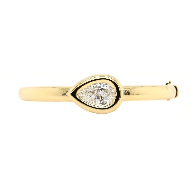 18k yellow gold bangle bracelet featuring a bezel set pear shaped diamond.