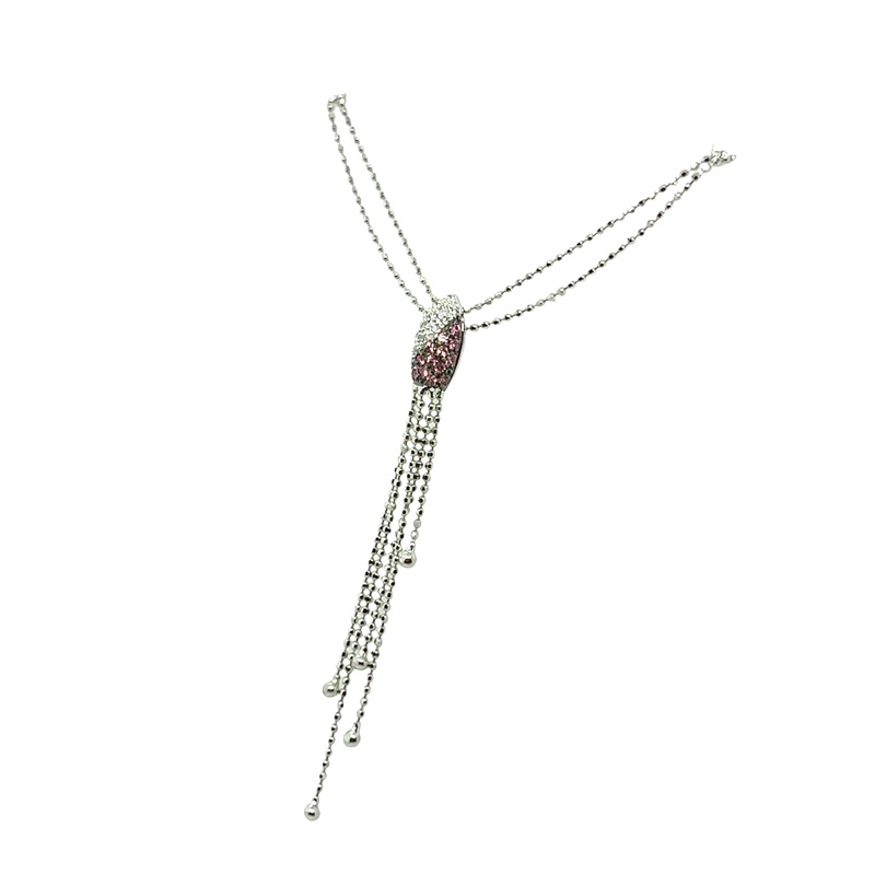 This elegant necklace features a double strand of diamond cut bead chain crafted from 18K white gold.Suspended vertically, this lariat style necklace has both pave' diamonds and pink sapphires on a tapered oval or bullet shape focal point with five chain d