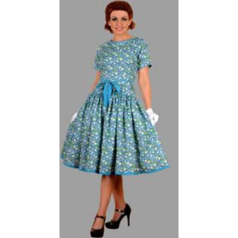 Includes: Late 1950's early 1960's floral print day dress accented with scoop neck, short sleeves, bodice fitted to the hip, gathered skirt w/attached net petticoat, blue piping trim with band at bottom and ribbon waist belt.Center back zip up closure.Colo