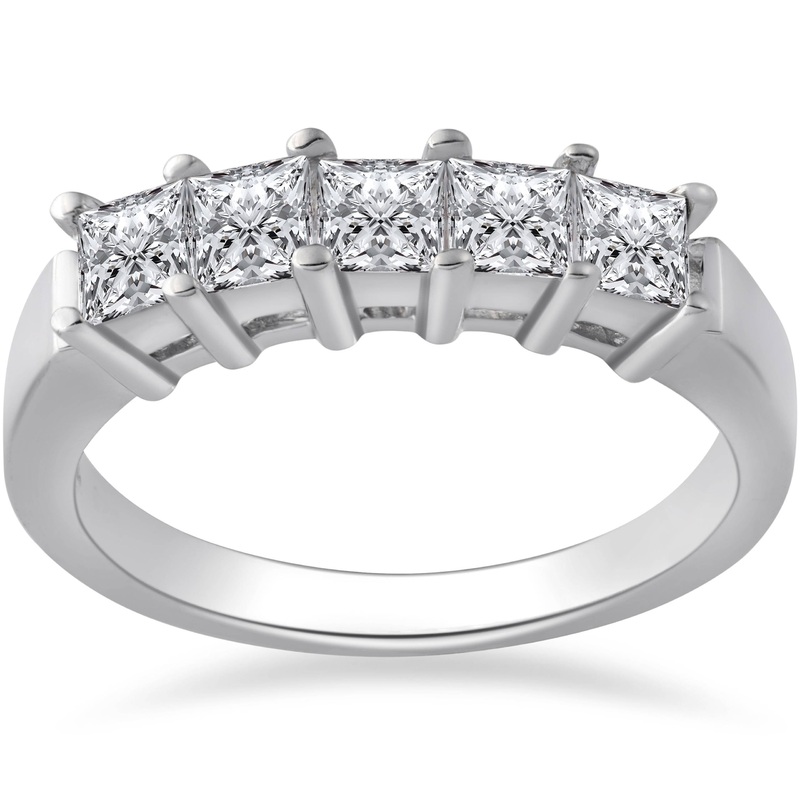 Women's ring features 5 princess square cut genuine diamonds prong set in solid 950 platinum.Item #: WR2727PTWidth: 3.5 mmWeight: 9 gMetal: 950 PlatinumDiamond Cut: PrincessDiamond Color: G/HDiamond Clarity: SIDiamond Carat: 1Diamond Quantity: 5Diamond Set