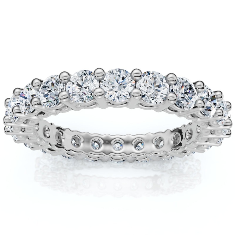 This classic women's eternity ring features round brilliant cut natural diamonds that encircle the entire ring. All diamonds are prong set in solid 14k white gold.Item #: EWB1238Width: 2.9 mmWeight: 3 gMetal: 14k White GoldDiamond Cut: RoundDiamond Color: