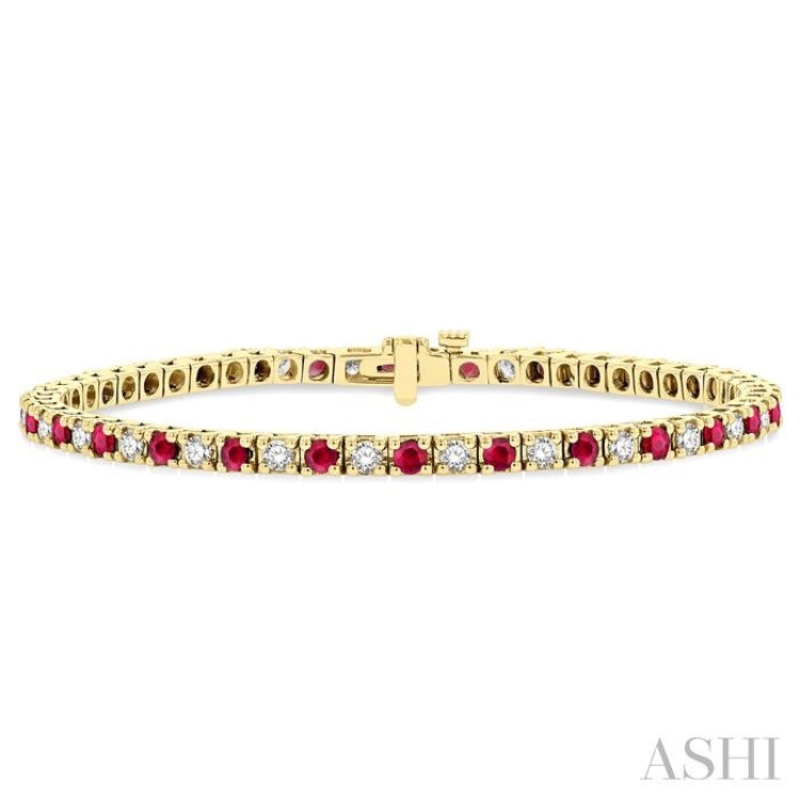 A classy precious gemstone tennis bracelet, this offers aesthetic appeal. It features a tightly linked square box shape links, with rubies and diamonds alternating accenting the box links. There are a total of 56 box links, with 28 each for the diamonds and rubies. A 2.5 MM round cut ruby each, total 28, and a prong set round cut diamond each, total 28, embellish the box links. A push-release open box clasp secures the tennis bracelet, which is styled in a polished finish 14 karat yellow gold. Total diamond weight is 1 1/2 Ctw.