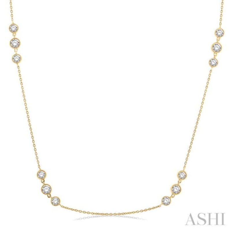Station necklaces are called so, as they feature breaks in the chain, where diamonds or charms are added to create the necklace. This classy diamond station necklace offers visual appeal and is a must-add to your collection. At each interval along the chain, there is a set of 3 each bezel set round cut diamond links, 6 sets in all, a total of 18 diamonds altogether. A milgrain border is seen encircling the diamonds. The necklace is an 18-inch Cat Chain, and is fashioned in a polished rhodium finish 14 karat yellow gold. Total diamond weight is 2 Ctw.