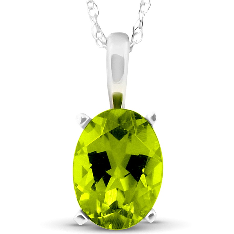 This classic women's pendant features a oval shape genuine peridot. An 18" 14k white gold clasp lock chain is included.Item #: PD5567PDTWidth: 8 mmWeight: 1.5 gMetal: 14k White GoldDiamond Setting: ProngGemstone Cut: OvalGemstone Color: GreenGemstone Clari