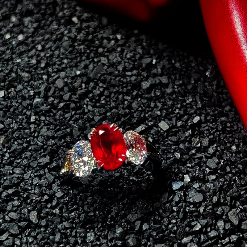 A truly classic ring featuring an amazing 3.06 carat Oval Natural Pigeon Blood Red Ruby, with each side showcasing two Oval GIA Reported Natural Diamonds, totaling 1.82 carats, D-E in color, VS2-SI1 in clarity. Crafted in Platinum, it is a one of a kind cu