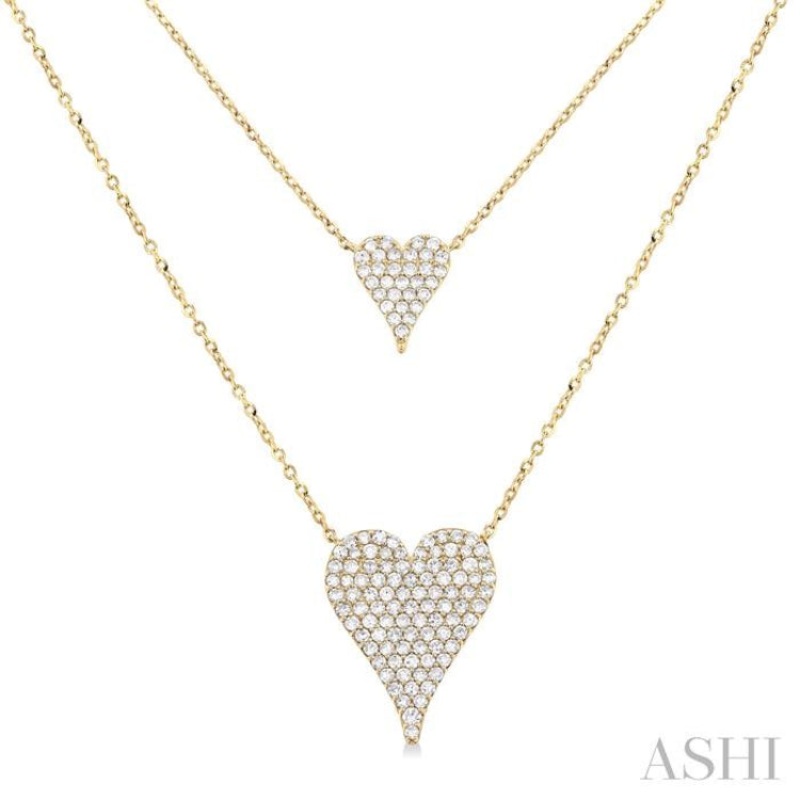 Hearts have long been cherished symbols of love, passion, and devotion in jewelry, representing the deep bond between loved ones. This diamond heart fashion necklace pays homage to this timeless symbol, capturing the essence of romance and affection with its exquisite design. It features a twin layer chain, with intricately designed heart pendants embellished with single cut diamonds. There is a large heart in the long outer chain and a small one on the shorter inner chain, meticulously crafted to evoke feelings of love and warmth. A total of 126 prong set single cut diamonds decorate the two hearts. An 18-inch cable chain completes the necklace, which is styled in a polished finish 14 karat yellow gold. Total diamond weight is 3/4 Ctw.