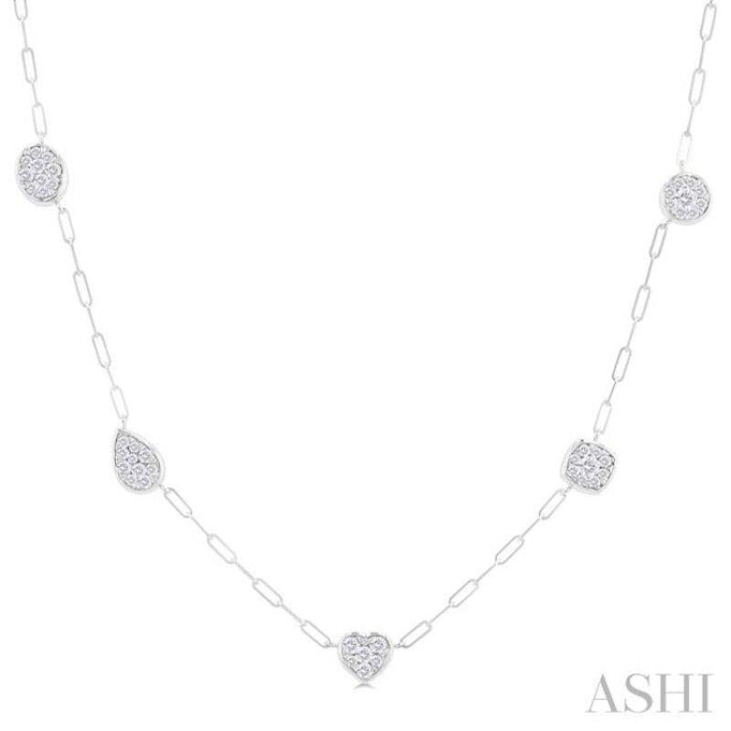 Stylish and pretty, this Lovebright diamond station necklace makes for an instant attraction. It features five distinct shaped mounts along the neckline, including a round, oval, pear, cushion, and heart-shaped mount, with the heart-shaped mount serving as the captivating centerpiece. Each mount is adorned with invisible set round cut diamonds, totaling 45 diamonds, which enhance the necklace’s sparkle and sophistication. An 18-inch, 1.50MM Paperclip chain completes this lovely station necklace, which is styled in a polished rhodium finish 14 karat white gold. Total diamond weight is 3/4 Ctw.