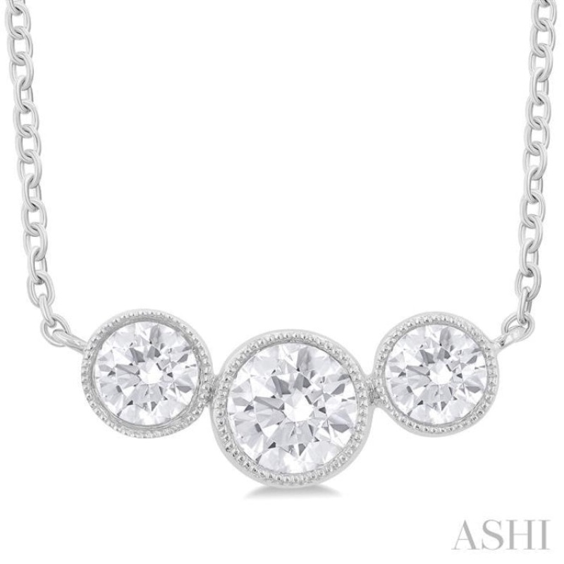 Discover the timeless symbolism of love with this dainty diamond necklace, a meaningful representation of enduring love and commitment. It is perfect for celebrating milestones or as a heartfelt gift that captures the essence of cherished memories. The necklace features a triple circular mount design, symbolizing the journey of a couple’s relationship through the past, present, and future. At the heart of the piece, a 1/3 Ctw bezel set round cut diamond represents the present, flanked by a 1/5 Ctw bezel set round cut diamond each, symbolizing the past and future of the couple’s love story. A delicate milgrain border enhances the beauty of the diamonds. The necklace is completed with a Cat-25 chain and secured by a lobster clasp closure. It is crafted in a polished rhodium finish 14 karat white gold. Total diamond weight is 3/4 Ctw.