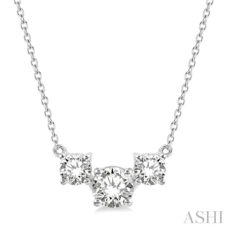 A striking diamond necklace, this makes a fine addition to one’s jewelry collection. It is simple yet eye-catching, with its three-stone center that glistens brightly, adding sparkle and glamour to the necklace. A 3/8 Ctw round cut center stone sits in the middle, while a 1/6 Ctw round cut center stone each flanks the middle stone. Attaching to the three-stone centerpiece is a Cat chain necklace. The centerpiece and the necklace are both styled in a rhodium finish 14 karat white gold. The total diamond weight is 3/4 Ctw.