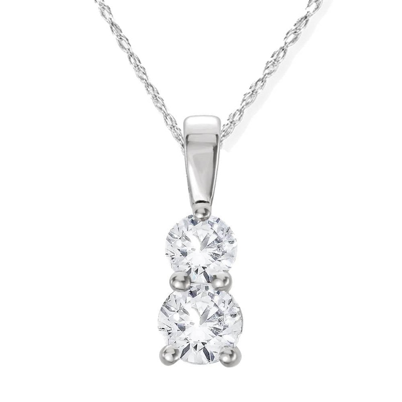 This beautiful 14k white gold diamond drop pendant features 2 round brilliant cut diamonds, graduating in size from smallest to largest with a total diamond weight of 3/4ct. An 18″ 14k white gold clasp lock chain is included.