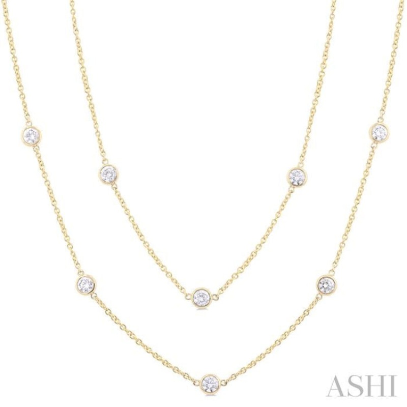 Timeless elegance meets modern versatility in this exquisite 30-inch diamond station necklace, a stunning addition to any jewelry collection. It features 24 bezel set 1/8 Ctw round cut diamonds, each placed delicately along the stations of the sleek 30-inch Cat-30 chain, ensuring a radiant sparkle with every movement. Whether worn for a sophisticated, elongated look or layered for added dimension, the necklace offers endless styling possibilities. Its luxurious polished finish 14 karat yellow gold styling, perfectly complements the brilliant diamonds. Total diamond weight is 3.00 Ctw.