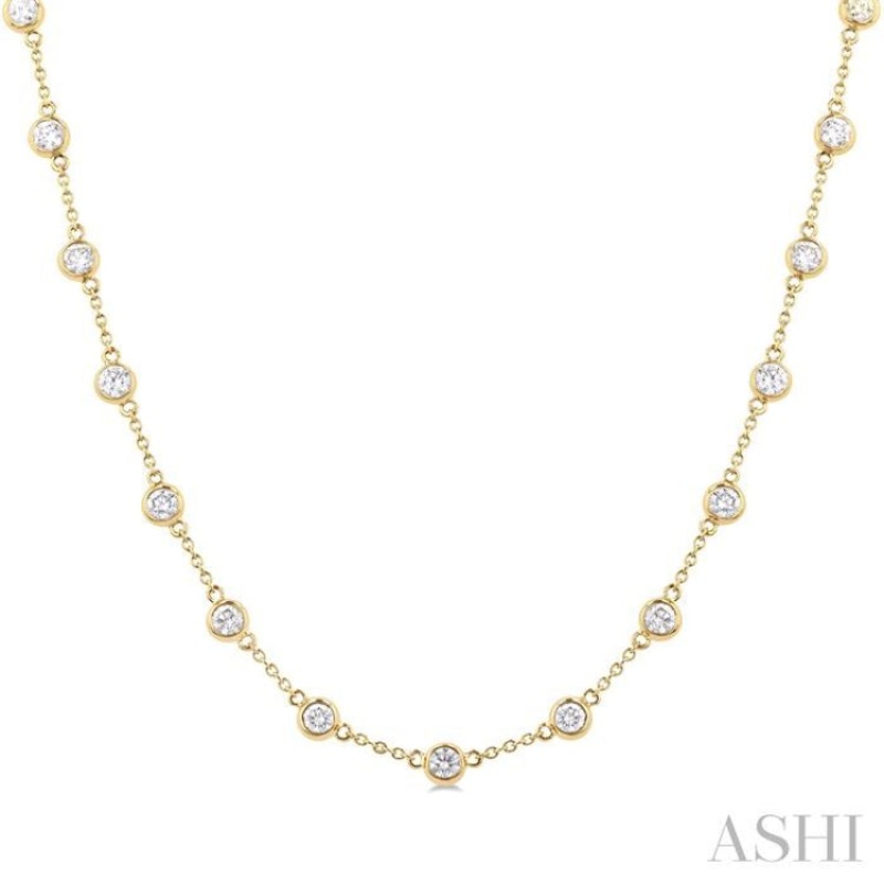 Indulge in the allure of understated luxury, with this bezel set diamond necklace, a radiant testament to elegance and sophistication. It features an embellishment of a round cut diamond each at every station along the neckline. There is a total of 32 round cut diamonds, each securely nestled in their individual bezel setting. The warm tones of yellow gold in the 18-inch cat station chain, provides a lustrous backdrop to this timeless necklace that effortlessly elevates any look. The diamond station necklace is fashioned in a polished finish 14 karat yellow gold. Total diamond weight is 3.00 Ctw.