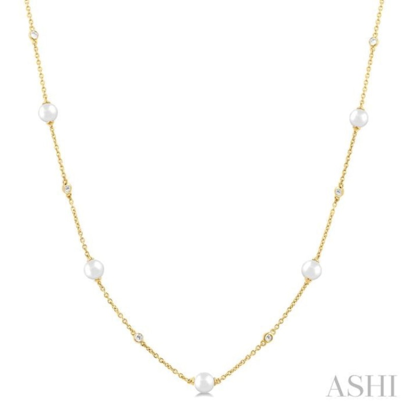 A versatile and elegant accessory, this Cultured Pearl and diamond station necklace exudes grace and refinement, combining the classic beauty of Cultured Pearls with the brilliance of round cut diamonds. Whether layered with other necklaces for a chic and modern look or worn alone for understated elegance, it is sure to enhance any ensemble with its timeless charm. Each station along the necklace features a graceful 3 MM round Cultured Pearl, total 9, alternating with a bezel set round cut diamond, total 8, highlighting the natural beauty and iridescence of the Cultured Pearls and the sparkle of the diamonds. A Cat Chain 25 completes the station necklace, which is designed in 14 karat yellow gold. The total diamond weight is 1/8 Ctw.