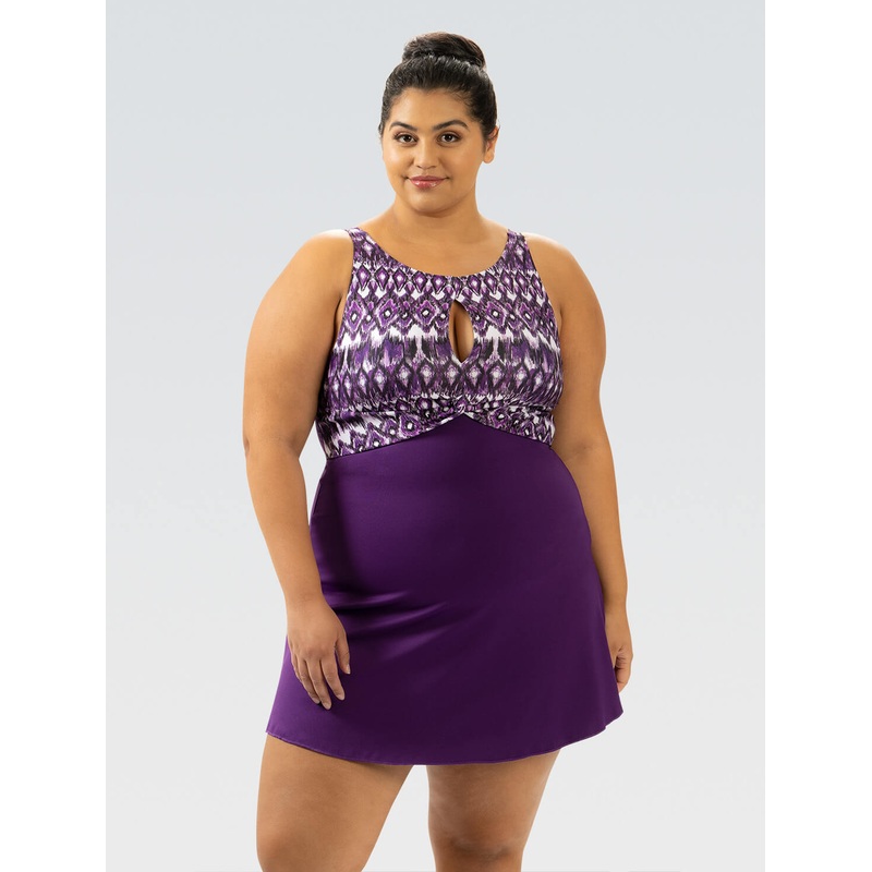 Limited Availability, get it while it lasts!This product is FINAL SALE and cannot be returned.Every time you step out, this Globetrotter print swim dress will have you feeling like a jet-setter! The intricate purple pattern on top blends perfectly with the