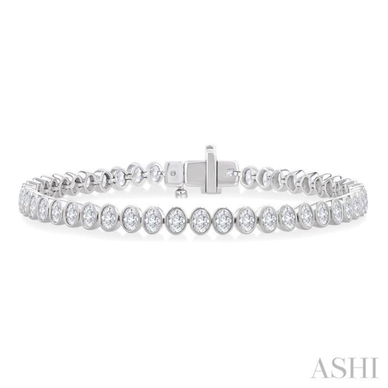 A reflection of your impeccable taste and style, this diamond tennis bracelet is destined to add panache to every ensemble. Its mesmerizing design features oval-shaped links arranged in a vertical north-south layout, along the bracelet length. Each of these links is decorated with a sparkling bezel set oval cut diamond, a total of 50 dazzling diamonds, exuding undeniable charm and elegance. A secure push-release box clasp closure provides both comfort and security. The diamond tennis bracelet is fashioned in a rhodium-finished 14 karat white gold. The total diamond weight is 4 1/2 Ctw.