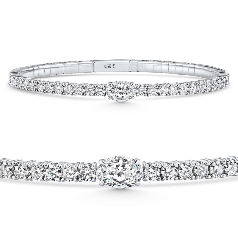 This stunning and classic women's bracelet features 28 round brilliant cut lab grown diamonds and a 1ct large oval shape lab grown diamond. The diamonds are set in solid 14k gold polished flexible polished hand assembled bracelet.Item #: FPS310H-MOWidth: 5
