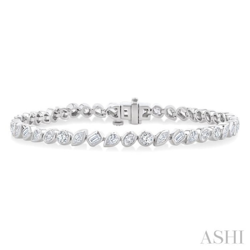 Get ready to dazzle with this awesome diamond fashion tennis bracelet, perfect for anyone looking to add a little sparkle and panache to their jewelry collection. The bracelet is a true masterpiece, showcasing a fabulous variety of diamond cuts that run all along its length. It features 5 distinct diamond cuts – round, oval, emerald, marquise, and pear cut diamonds, 9 each bezel set in its own uniquely shaped link, creating a fluid and captivating row of mixed cut brilliance. Designed for both elegance and fun, the bracelet secures with a push-release open box clasp, ensuring it stays put. The rhodium finish 14 karat white gold body adds an extra touch of luxury to the fashion bracelet. The total diamond weight is 4 Ctw.