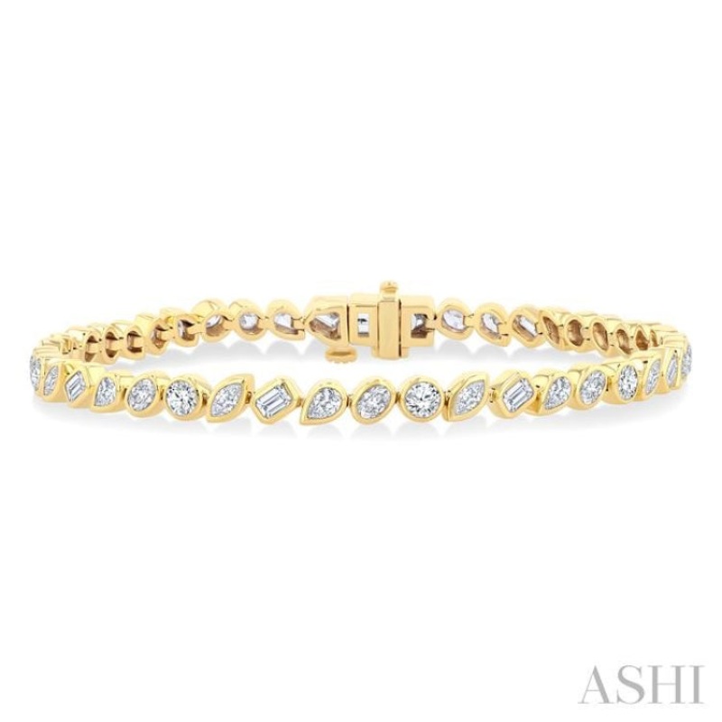Get ready to dazzle with this awesome diamond fashion tennis bracelet, perfect for anyone looking to add a little sparkle and panache to their jewelry collection. The bracelet is a true masterpiece, showcasing a fabulous variety of diamond cuts that run all along its length. It features 5 distinct diamond cuts – round, oval, emerald, marquise, and pear cut diamonds, each bezel set in its own uniquely shaped link, creating a fluid and captivating row of mixed cut brilliance. Designed for both elegance and fun, the bracelet secures with a push-release open box clasp, ensuring it stays put. The 14 karat yellow gold body adds an extra touch of luxury to the fashion bracelet. The total diamond weight is 4 Ctw.