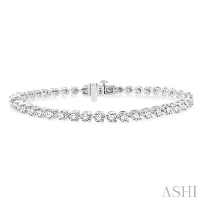 If you are looking for glamour and beauty, then this mesmerizing diamond tennis bracelet is what you should check out. This dazzling bracelet is perfect for any occasion and worth considering every bit. It features integrated triple prong link mounts, all the way from one end to the other. Each of the tri-prong mounts is embellished with a prong set round cut diamond. There is a total of 46 diamonds decorating the links. An open box clasp closure with a snap-in safety latch on the side completes the bracelet, which is fashioned in a rhodium finish 14 karat white gold. The total diamond weight is 4 Ctw.