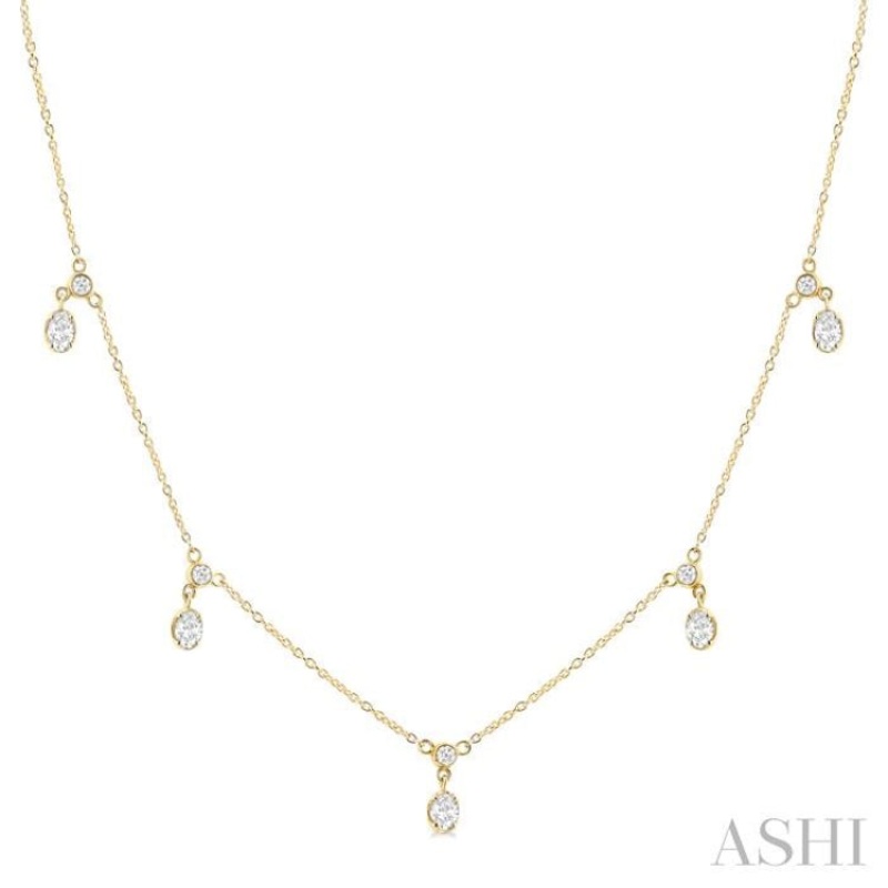 A timeless blend of sophistication and sparkle, this diamond station necklace is a perfect choice for elevating any look. It features 5 bezel set round cut diamond links, elegantly spaced along the stations of the sleek 18-inch Cat-25 chain necklace, enhancing its contemporary allure. Each of these round diamond links suspends an oval-shaped mount, cradling a dazzling 1/10 Ctw oval cut diamond, offering a perfect balance of brilliance and style. The diamond station necklace is designed in a polished finish 14 karat yellow gold, adding warmth and radiance. Total diamond weight is 5/8 Ctw.