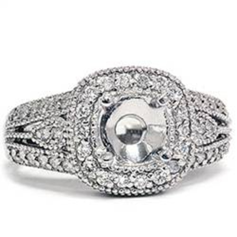 This fancy women's engagement anniversary setting features round brilliant cut accent diamonds. All diamonds are pave set in solid 14k white gold. .62ct total diamond weight. This will fit a 5.5-6mm round stone.Item #: MGT6381Width: 12 mmWeight: 5.1 gMetal
