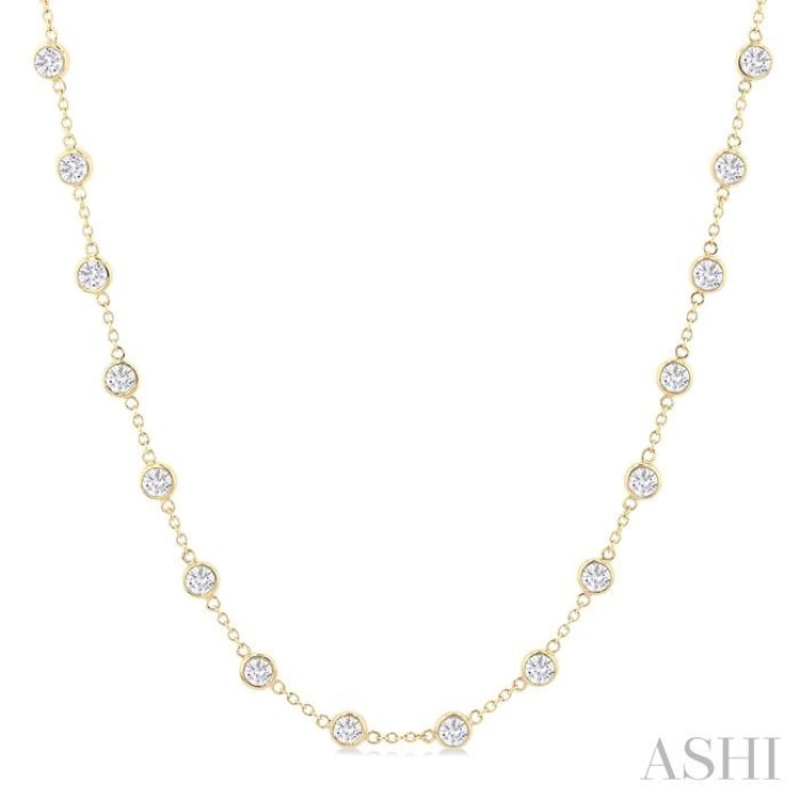 Indulge in the allure of understated luxury, with this bezel set diamond necklace, a radiant testament to elegance and sophistication. It features an embellishment of a round cut diamond each at every station along the neckline. There is a total of 32 round cut diamonds, each securely nestled in their individual bezel setting. The warm tones of yellow gold in the 18-inch cat station chain, provides a lustrous backdrop to this timeless necklace that effortlessly elevates any look. The diamond station necklace is fashioned in a polished finish 14 karat yellow gold. Total diamond weight is 5.00 Ctw.