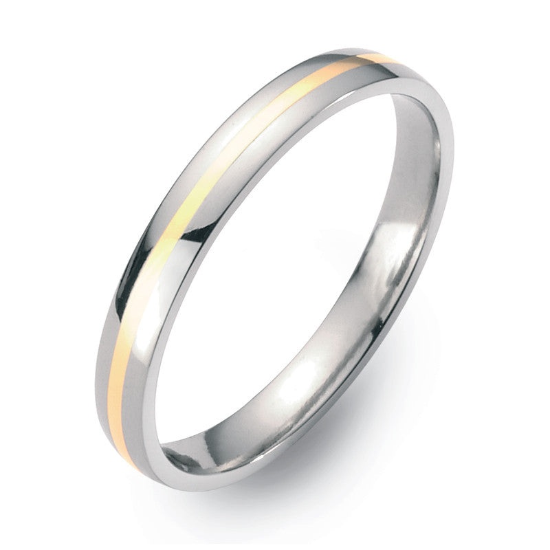 FINAL SALE !!3mm wideAll Polished Titanium Half-Round Ring, Thin, with line of polished 18kt. Yellow Gold Inlay.The TeNo Titanium advanced titanium jewelry is like no other. The finish is superior and the look is clean and attractive. They introduce titani