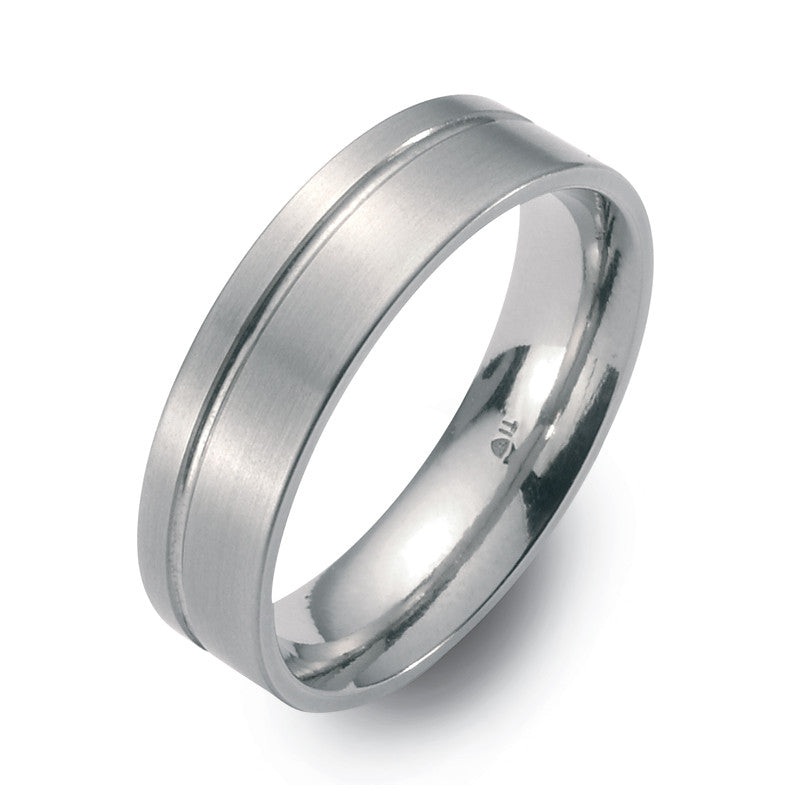 6mm wideMatte Finish with polished grooved line going all the way around.The TeNo Titanium advanced titanium jewelry is like no other. The finish is superior and the look is clean and attractive. They introduce titanium to 18kt. Yellow and Red Gold, and al