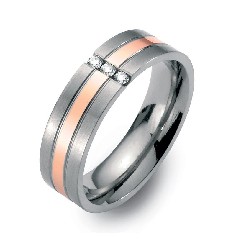 FINAL SALE !!5.5mm wideHalf Matte, Half Polished Ring with center stripe of 18kt. Red Gold Inlay and set with 3 x 0.02ct. Diamonds for a total weight of 0.06ct.The TeNo Titanium advanced titanium jewelry is like no other. The finish is superior and the loo