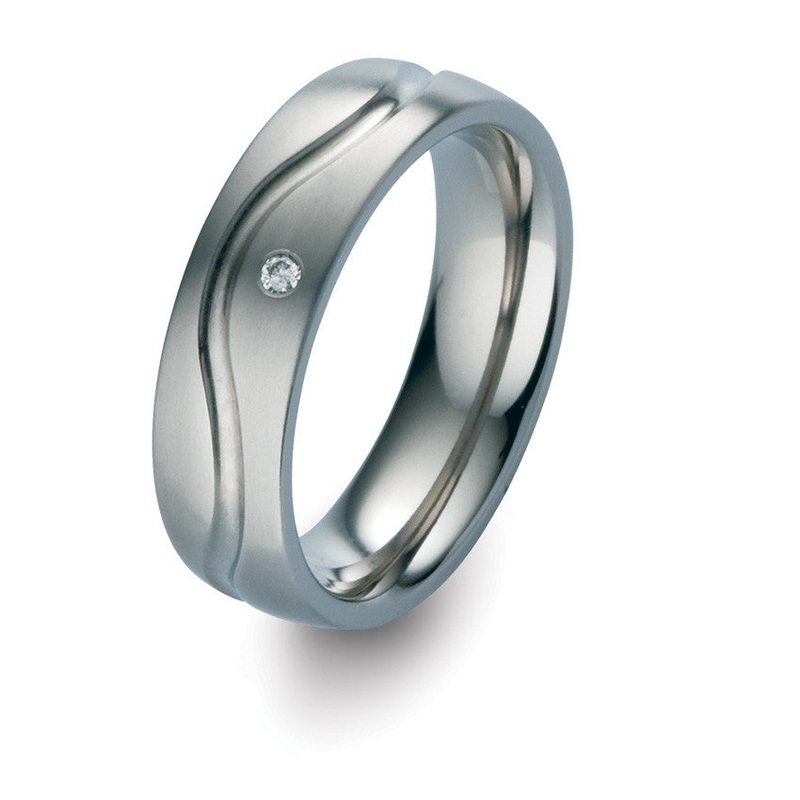 TeNo Titanium brushed ring with polished curvy line, set with a 0.02ct. Diamond6mm wideThe TeNo Titanium advanced titanium jewelry is like no other. The finish is superior and the look is clean and attractive. They introduce titanium to 18kt. Yellow and Re