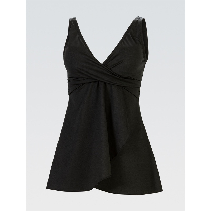 Limited Availability, get it while it lasts!This product is FINAL SALE and cannot be returned.With a flowy and free silhouette this black tankini top is one of our favorites! Featuring a V-neck line and a wrap skirt, the length of this top goes a bit beyon