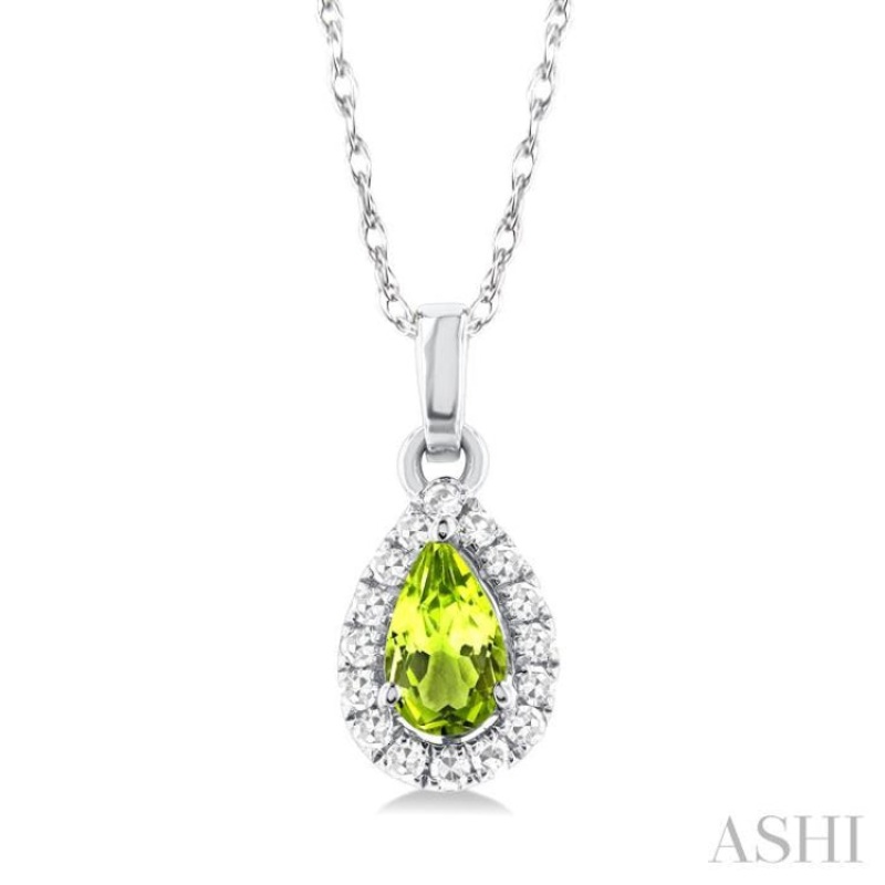 An alluring peridot and diamond Semi-Precious pendant, this well complements a variety of evening wear. It features a pear-shaped frame mount, with a 5x3 MM pear shape peridot center stone. Bordering the center stone, on the pear frame, are 16 micro wall s