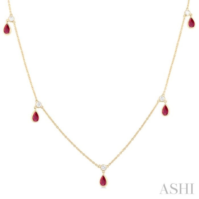 An intricate precious gemstone station necklace, this offers instant appeal. It is dainty, an elegant and dressy, making it a quick buy for many. The station necklace features a bezel set round cut diamond, total 5, placed at certain intervals along the necklace. Each of these bezel set diamonds, suspends a 5×3 MM pear cut ruby under it, total 5. The precious station necklace is an 18-inch Cat Chain. It is fashioned in a polished finish 10 karat yellow gold. Total diamond weight is 1/8 Ctw.