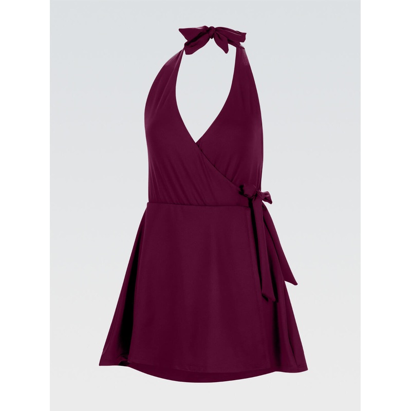 Limited Availability, get it while it lasts!Ready for your new favorite swimsuit? How about you make it a swim dress?! This cabernet colored swim dress with a halter neck and wrap front body design is functional and fabulous! Featuring a mini skirt length
