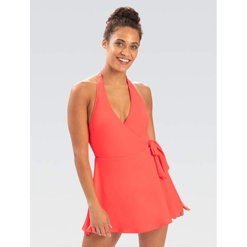 Limited Availability, get it while it lasts!Are you ready for your new favorite swimsuit to hit your closet? Try this swim dress and you won't be disappointed! This coral spice colored swim dress with a unique halter neck and wrap front body design is the