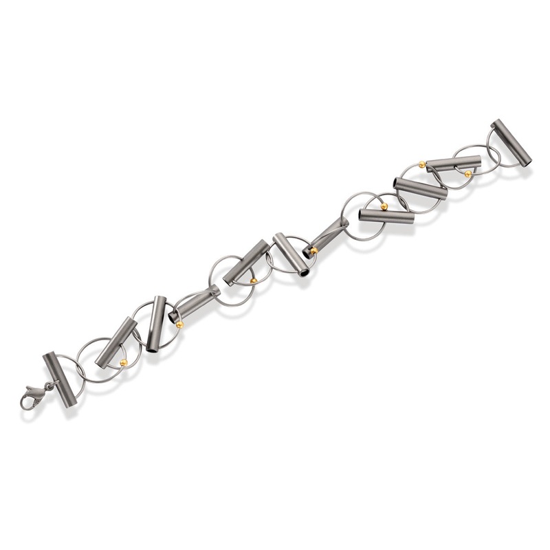 Titanium link bracelet with Open Circle shaped links, tube links and 18kt. Gold Beading.