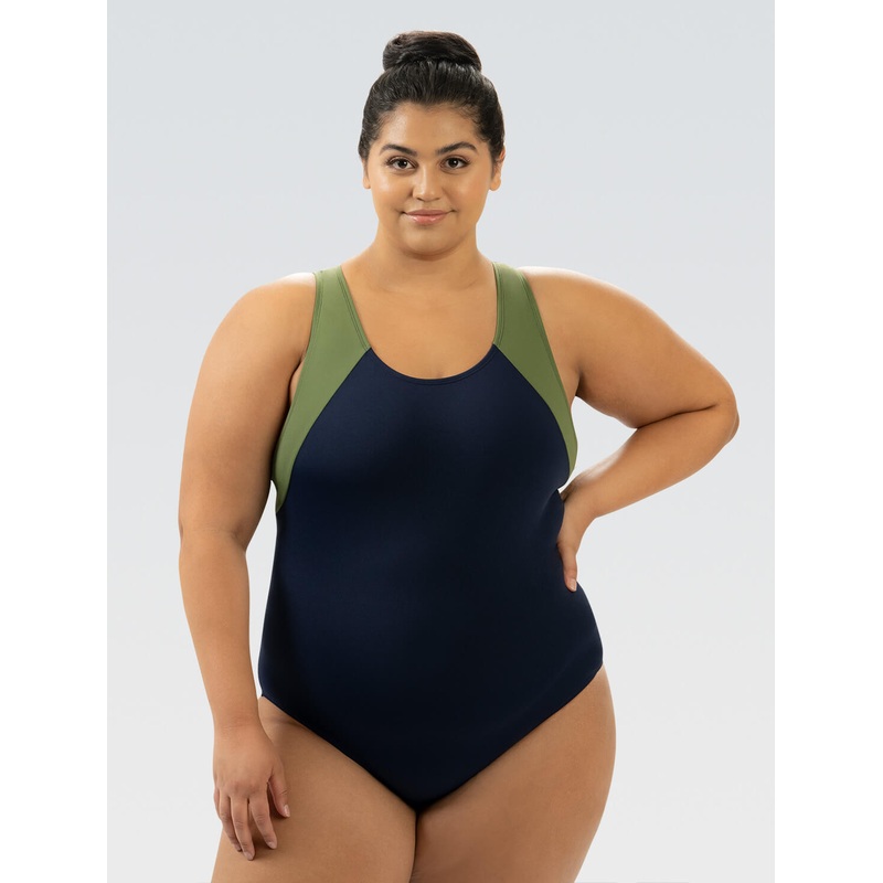 The beautiful contrast between navy and olive sets this suit apart from the rest! Get ready to feel your best every time you step out in this colorful, moderate lap suit!