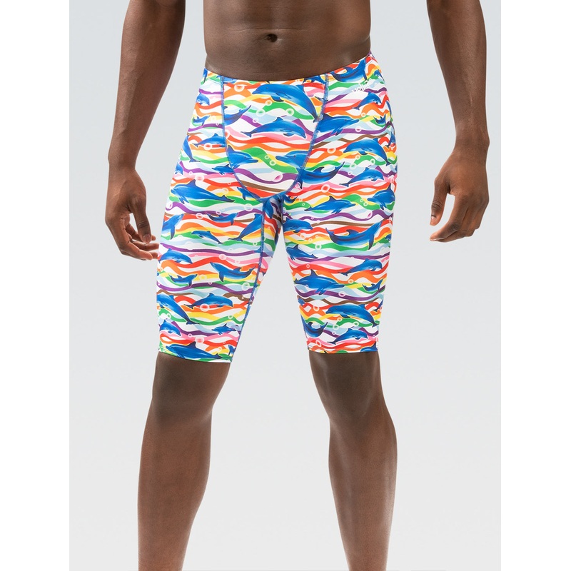 Limited Availability, get it while it lasts!Show your pride as you change the tides in this Pride Tide Jammer Swimsuit for men. Features & Benefits:Jammer swimsuit in all over Pride Tide PrintPrint features multi-color design with swimming dolphin graphicS
