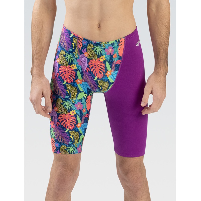 Get ready to be the king of the jungle and the pool – in these Jungle Jam jammers! This mens jammer has a fun mix and match detail that puts multicolored prints and solid purple on full display during your next practice at the pool!