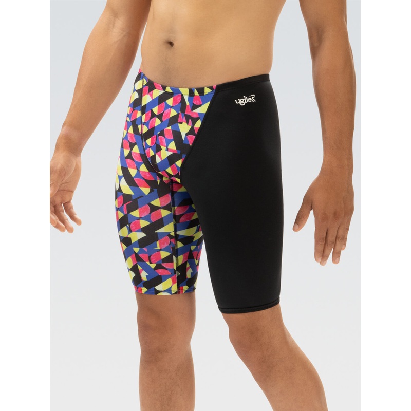 Experience vibrant style with the Gamescape print men’s jammer swimsuit. The vibrant geometric design featuring blue and black zig zags paired with pink and green dots is complemented by black color blocking on the left leg. Engineered to fit tightly to the body, this jammer withstands rigorous training sessions.