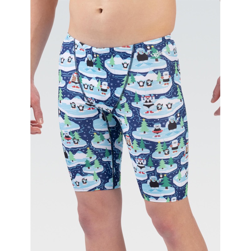 Limited Availability, get it while it lasts!Dive into the holiday season with the Uglies Men's Yeti Plunge Jammer Swimsuit. Adorned with a joyful Yeti family and their penguin companions, this print brings the fun of winter's polar plunge to every swim. Th