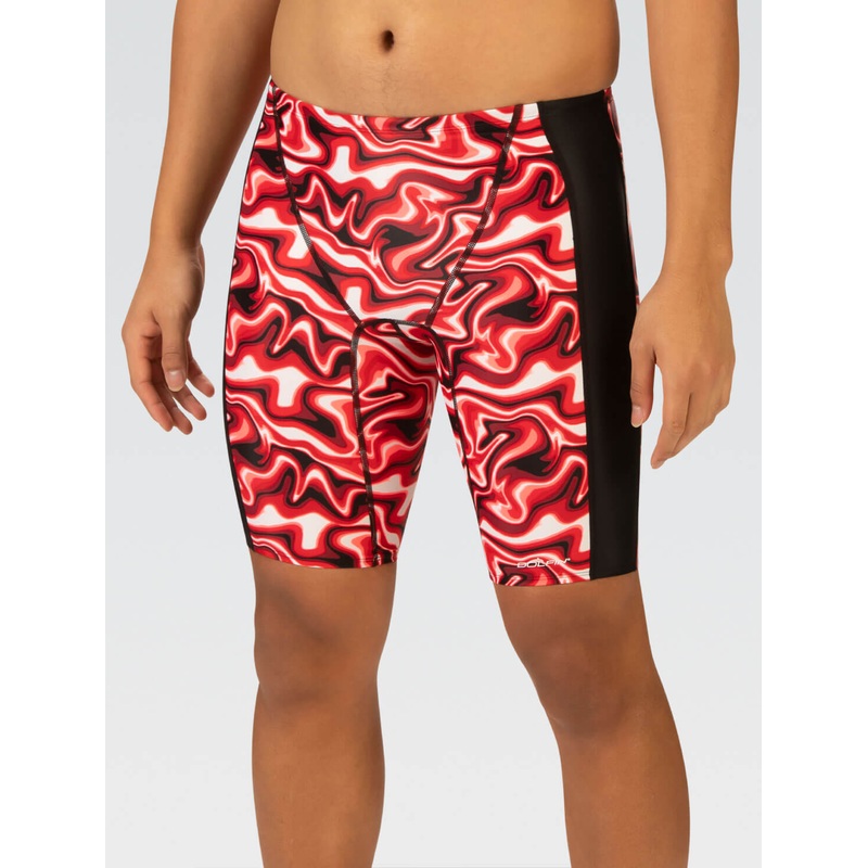 Limited Availability, get it while it lasts!This product is FINAL SALE and cannot be returned.This men's jammer is ready to jam out at the pool! With the our new all over surge print in red and accented with black side pannels this team suit for men is sur