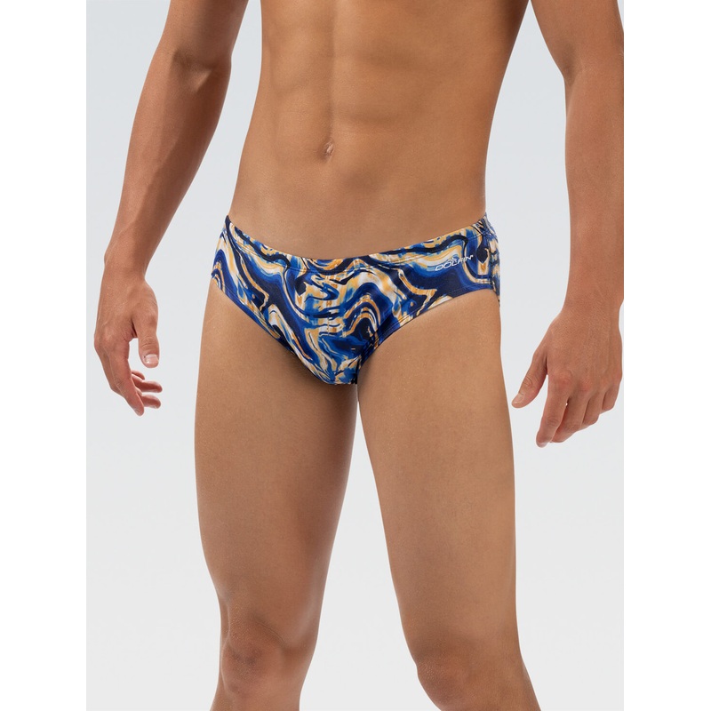 Unleash your competitive spirit with the Reliance Men's Racer in an abstract, rolling hills Navy and Gold Blaze print. Engineered in our most reliable 100% polyester fabric, this racer is built for durability and tested to withstand over 300+ hours of chlo