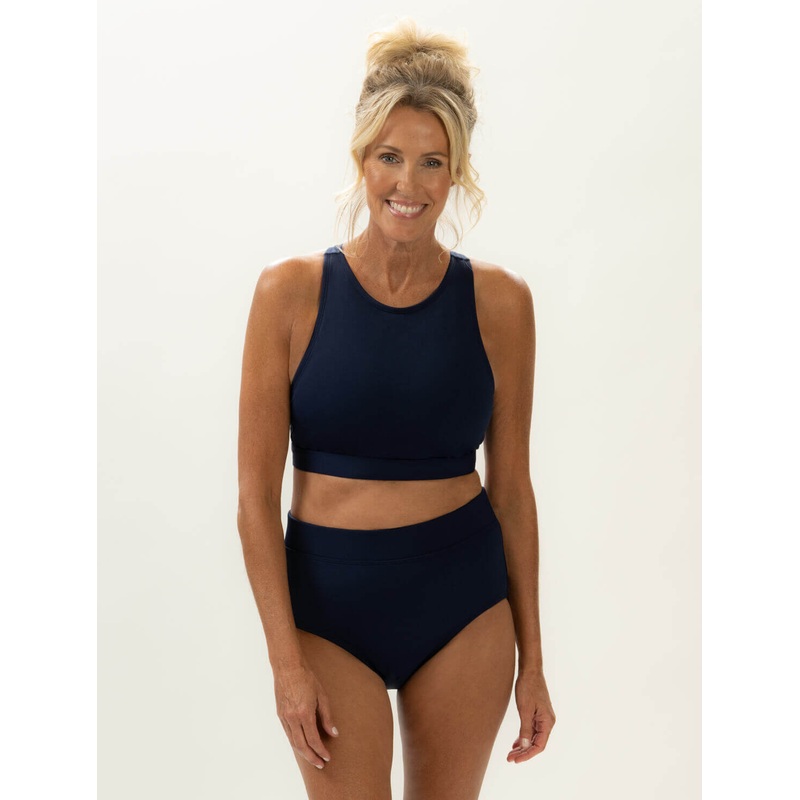 Experience the ultimate in comfort and versatility with the navy high neck longline bikini top! The high neckline and racerback design offer a modern twist, while the absence of cups ensures a free feel and comfortable fit. Enjoy the perfect blend of comfort and support as you embrace any water workout in this captivating navy bikini top!